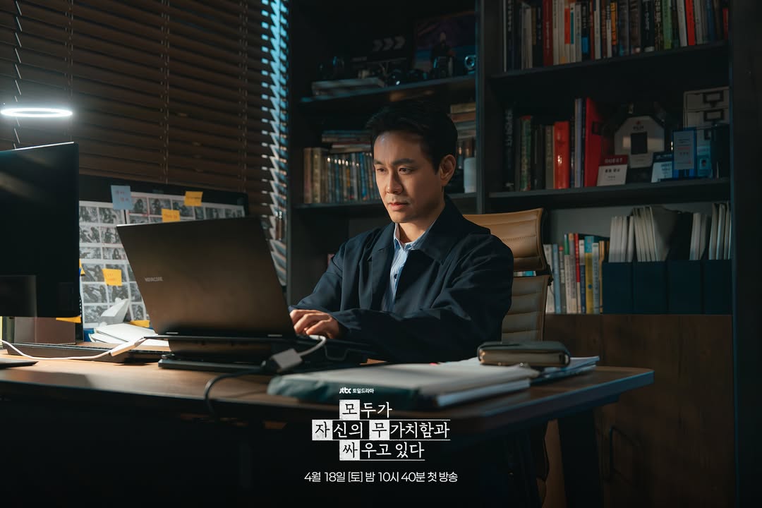 The next stills offer a sharp contrast. In one, he stares at a monitor as he works intensely, and in another, he clenches his jaw with a tense expression, struggling to prove he is never the same “worthless type” as Hwang Dong Man. Paradoxically, he is also the character who reacts most strongly and crumbles at Hwang Dong Man’s mere presence or a single word from him.