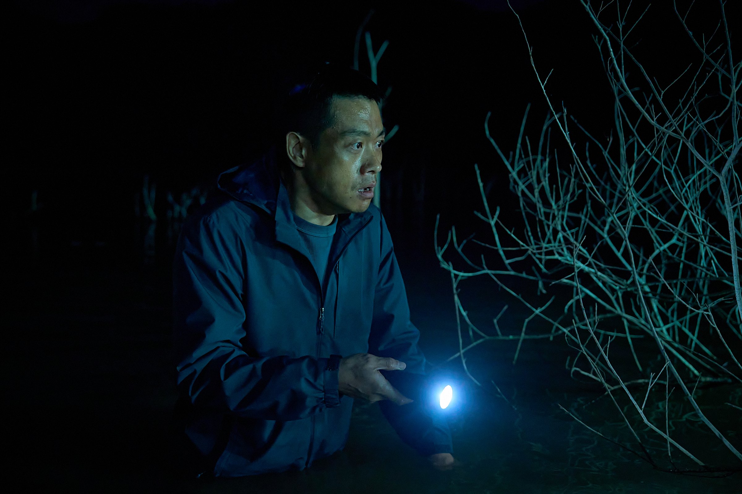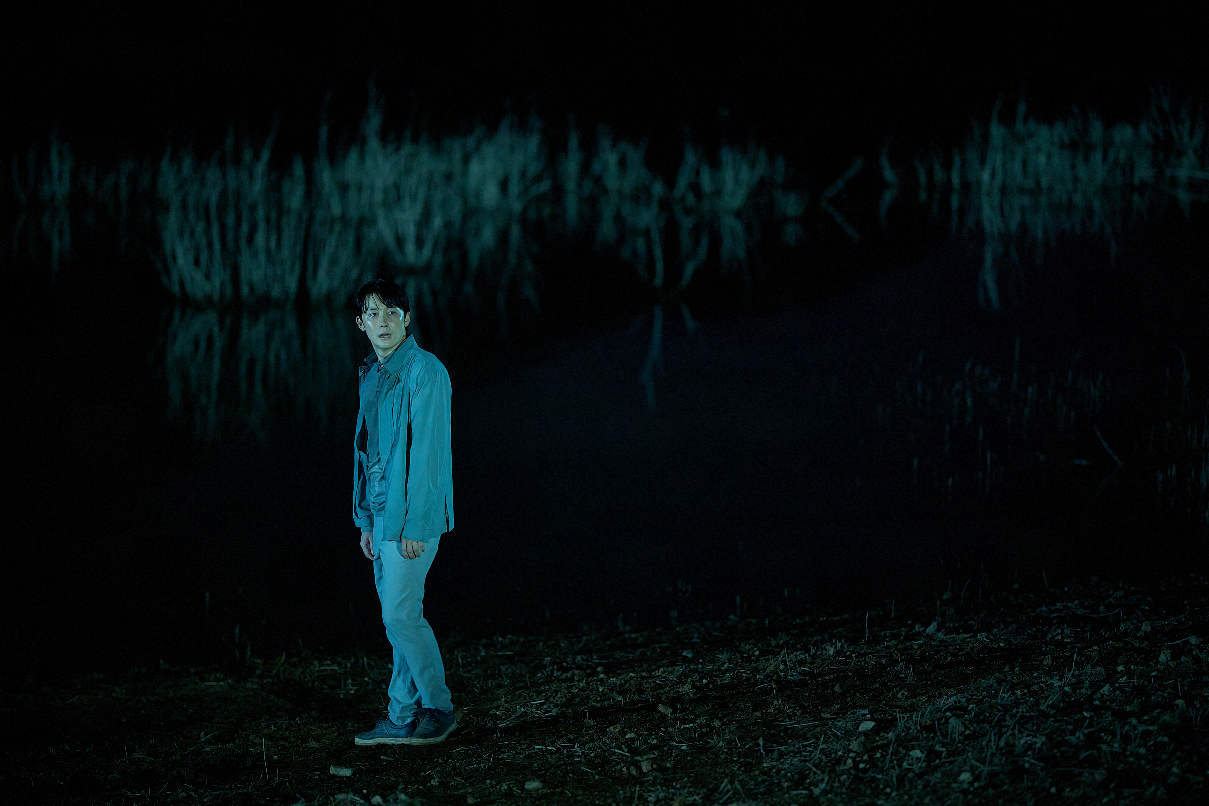 Nearby, Kyo Sik (Kim Jun Han) stands by the water, staring into the distance, amplifying the eerie stillness of the reservoir. Meanwhile, Kyung Tae (Kim Young Sung), frozen in place while holding a dim flashlight, raises questions about how he ended up deep within Salmokji’s darkness.