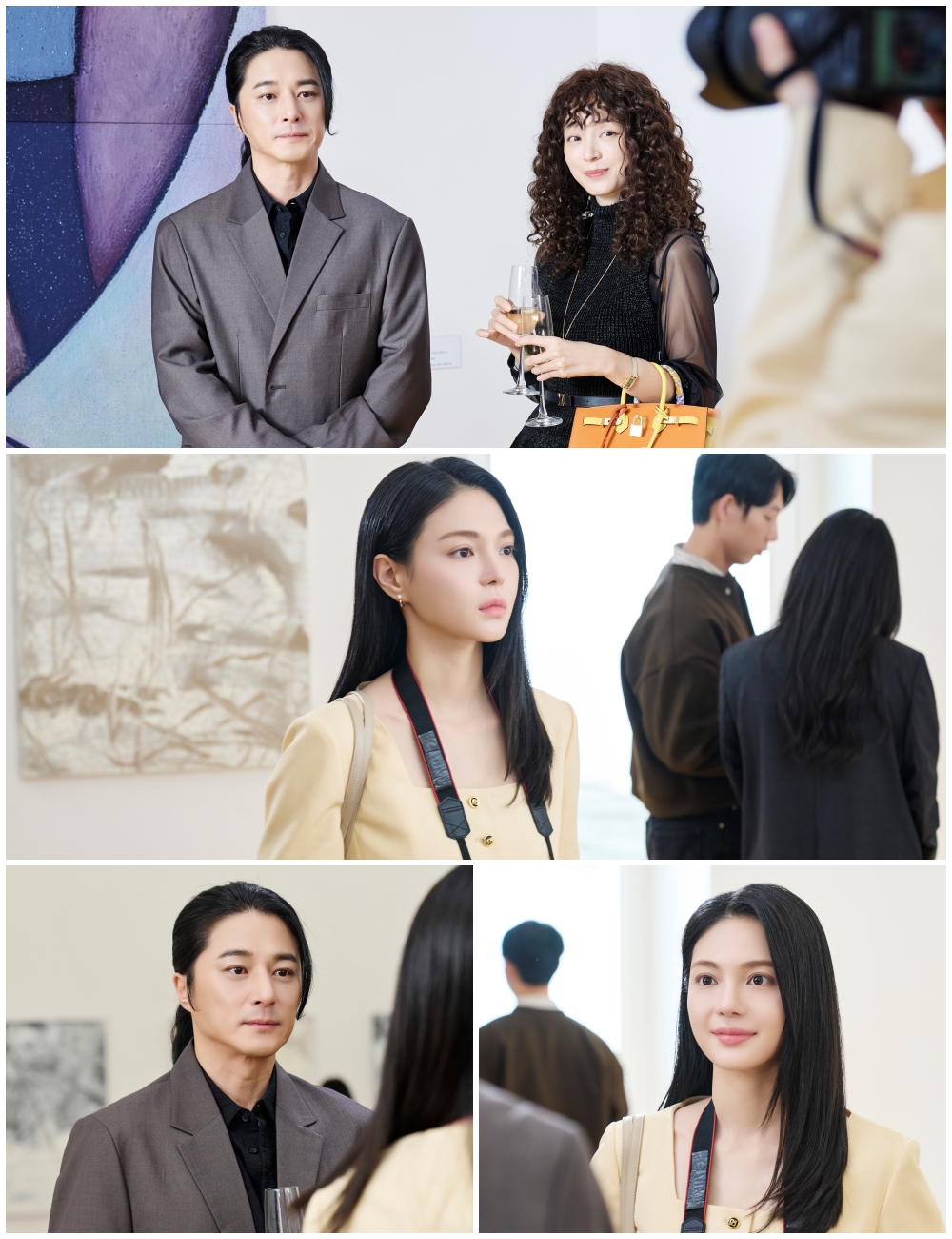 In the upcoming Episode 4, Geum Ba Ra, Hyun Ran Hee, and Paul Kim will finally come face-to-face. The stills capture Geum Ba Ra and Hyun Ran Hee visiting Paul Kim’s exhibition. Hyun Ran Hee displays a bright smile throughout, expressing keen interest in Paul Kim, while Geum Ba Ra greets him by handing over her business card. In contrast to the composed demeanor of the two women, a subtle yet unmistakable tension crosses Paul Kim’s face, raising curiosity about the ripple effects their encounter—set to become the center of the storm—will bring.