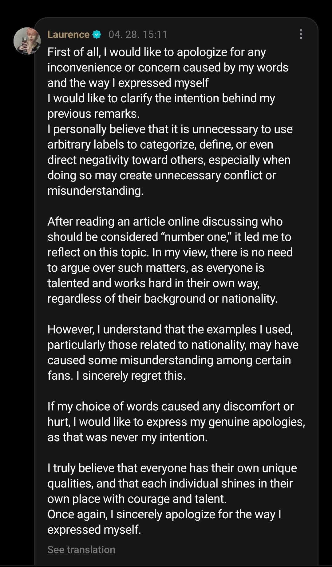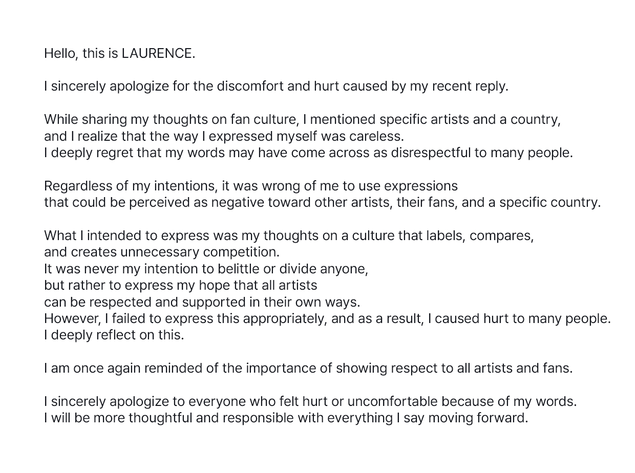 Both Laurence’s official English apology and the English apology he posted on Weverse can be found below: