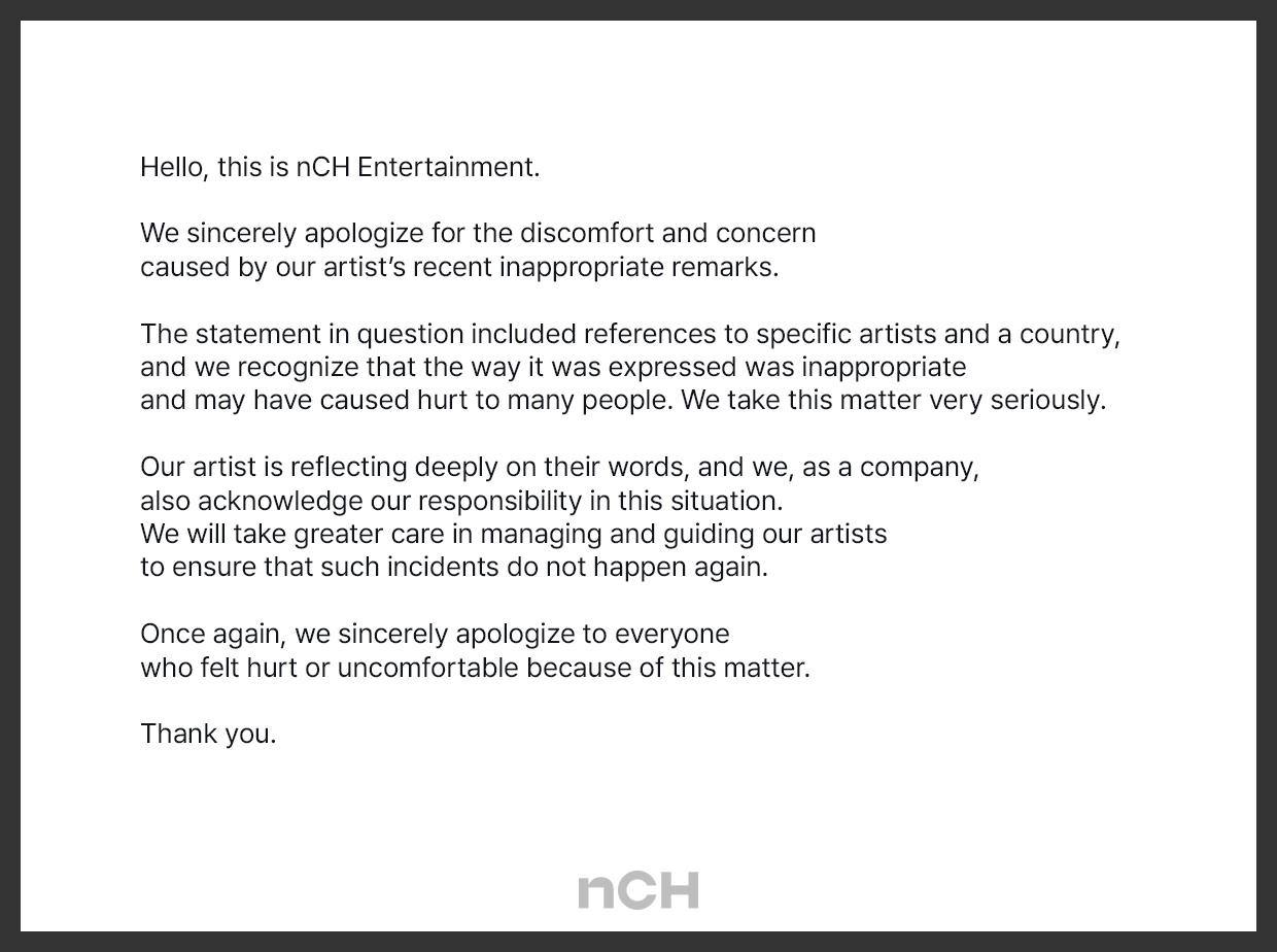 Later that day, both Laurence and n.SSign’s agency issued separate apologies regarding the comment in question, with Laurence posting two different apologies in English.